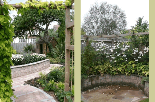A rose covered pergola creates a cosy shaded seating area in which to relax.